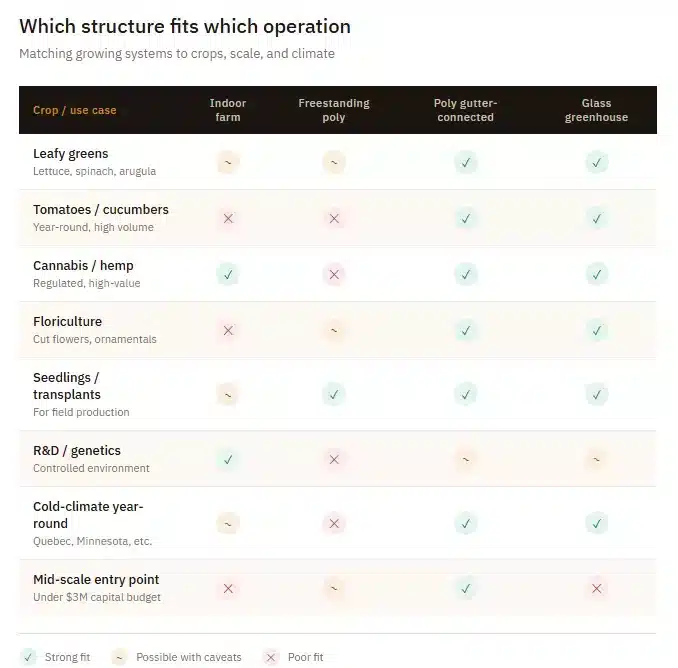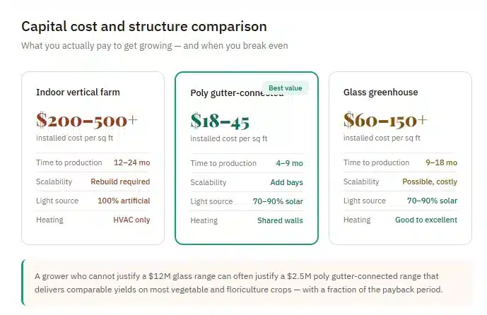 Here is where the conversation usually gets too binary. Critics of indoor farming either defend the failed VC model or point vaguely toward “greenhouses” as the answer, as if all greenhouses are the same. They are not. And for growers serious about making a capital decision, the differences matter enormously.