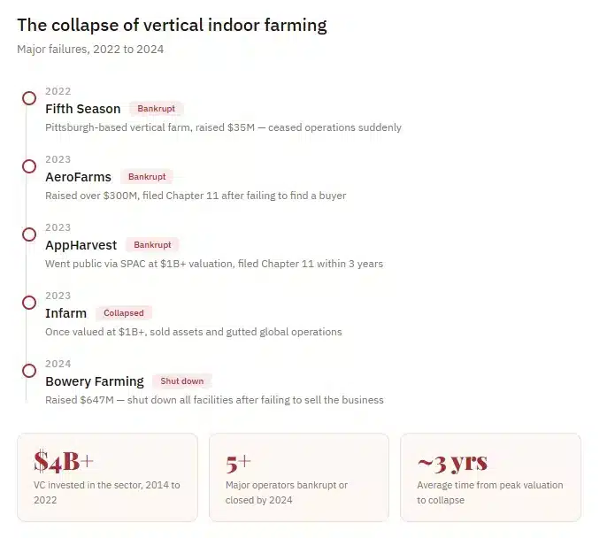 Indoor farming attracted capital because it told a compelling story, food security, climate resilience, local supply chains, and because investors in 2019 were willing to believe that technology could disrupt any industry. The category raised over $4 billion globally between 2014 and 2022. Then interest rates rose, growth-at-all-costs fell out of fashion, and suddenly investors wanted to see a path to profitability. That path, in most cases, didn’t exist.